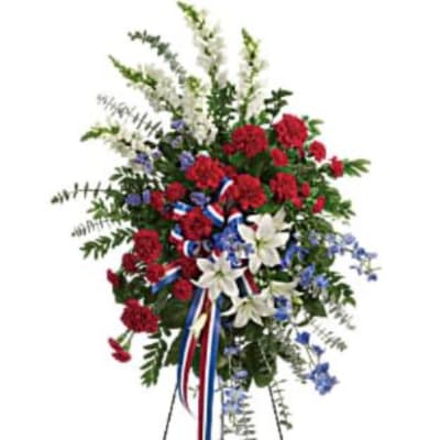 Price: $190.00Exquisite Tribute Standing Spray-Blue Ribbon
